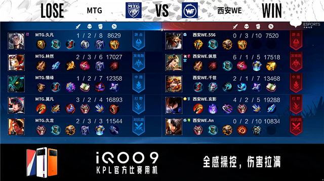 2分40秒,西安WE控下暴君,随后MTG镜击杀梦奇拿下一血。3分07秒,MTG控下先知主宰。3分55秒,中路团,双方1换1,随后MTG破掉西安WE上一塔。5分45秒,中路团,双方再次1换1。7分04秒,MTG控下暴君。7分24秒,西安WE控下先知主宰,随后团战西安WE打出2换3。7分58秒,西安WE破掉MTG中一塔。10分01秒,西安WE鲁班七号击杀猪八戒。10分29秒,西安WE控下暗影主宰。11分30秒,西安WE破掉MTG中二塔,随后团战西安WE打出0换2。11分55秒,西安WE破掉MTG中高地及下二塔。12分12秒,西安WE破掉MTG下高地。12分26秒,西安WE边团边拆摧毁MTG水晶赢下比赛。