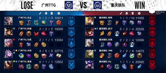双方和平开局。1分钟下路交火,蒙犽拿下一血。2分15秒露娜拿下暴君。3分57秒露娜拿下主宰。4分50秒中路团战,双方1换1。5分15秒蒙犽推掉下路一塔。6分08秒李元芳推掉中路一塔。6分30秒阿古朵拿下暴君。6分55秒野区团战,广州TTG打出1换2。8分20秒露娜拿下主宰。8分40秒野区团战,双方1换1。10分20秒露娜拿下暴君。11分30秒露娜拿下主宰。13分20秒广州TTG推掉中路一塔。15分20秒露娜拿下暴君。16分45秒露娜拿下主宰。17分51秒蒙犽推掉下路高地塔。20分10秒中路团战,姜子牙被击杀。20分30秒中路团战,重庆狼队打出1换2。21分钟重庆狼队拿下风暴龙王。22分20秒露娜被击杀。23分14秒广州TTG上路和中路高地塔被破。28分20秒风暴龙王团,重庆狼队打出1换3。29分07秒重庆狼队推掉水晶拿下本场比赛。
