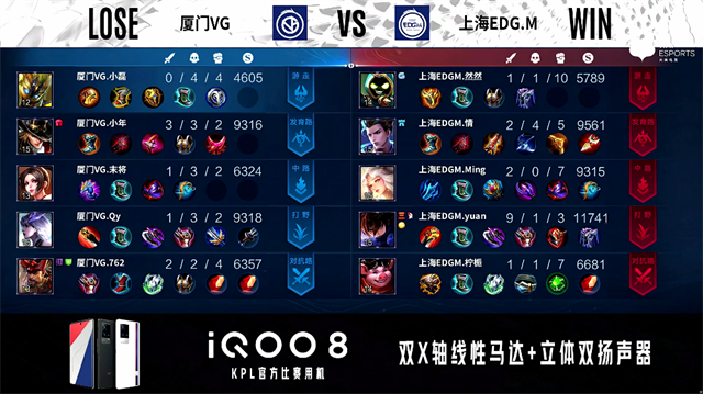 2分钟,双方团,厦门VG打出0换2。3分57秒,厦门VG下路击杀周瑜。4分53秒,上海EDG.M控下暴君。5分14秒,厦门VG破掉上海EDG.M上一塔,上海EDG.M破掉厦门VG下一塔。6分44秒,上海EDG.M破掉厦门VG上一塔。7分58秒,双方团,厦门VG打出2换5团灭对手。11分07秒,厦门VG控下暗影暴君。11分53秒,厦门VG破掉上海EDG.M中一塔。12分11秒,中路团,上海EDG.M打出2换3。13分20秒,双方团,上海EDG.M打出1换2。14分12秒,上海EDG.M控下暗影主宰。15分35秒,上路团,上海EDG.M打出0换3。16分钟,上海EDG.M破掉厦门VG上高地,随后一波摧毁厦门VG水晶赢下比赛。