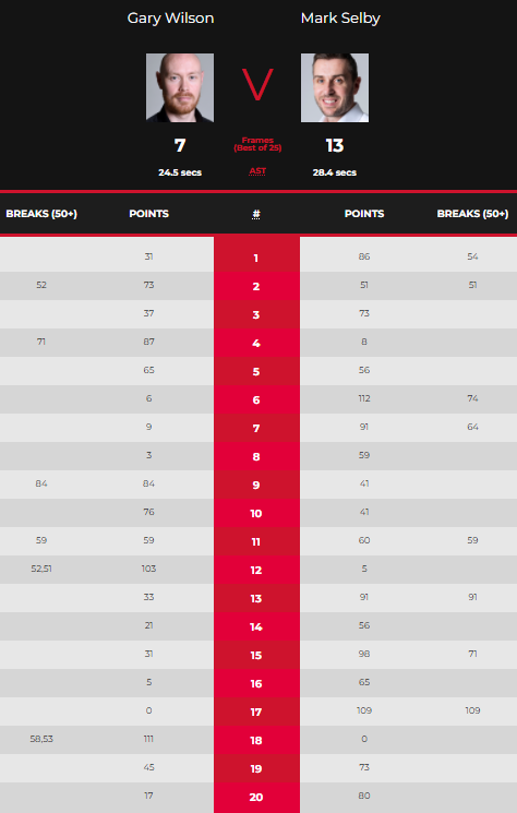 第二阶段,加里-威尔逊在前四局打了一个3比1,追到了6比6。塞尔比随后连胜四局,以10比6结束第二阶段。第三阶段开始之后,塞尔比单杆破百拿下第十一局,加里-威尔逊追回两局,塞尔比连胜两局以13比7拿下了比赛。