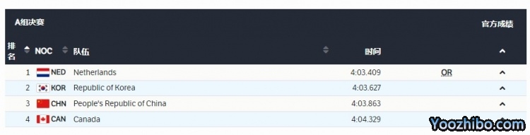 最终,中国队以4:03.863的成绩获得铜牌,荷兰队(打破冬奥会纪录)和韩国队分列一二位。