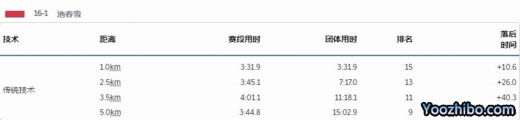池春雨第一棒出战,用的是传统技术,最终她滑完5公里用时15分02秒9,落后第一名41.6秒,排名第9。