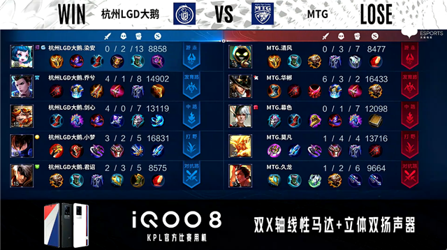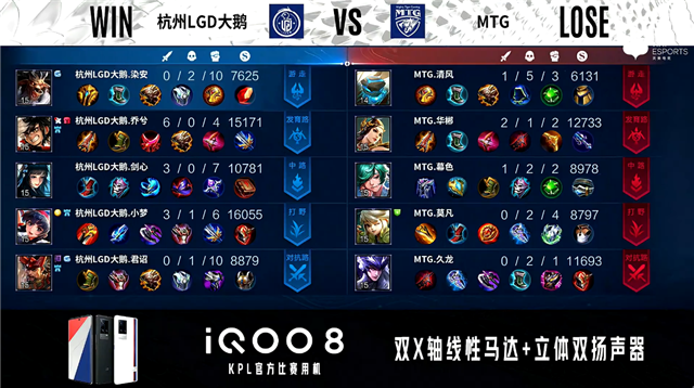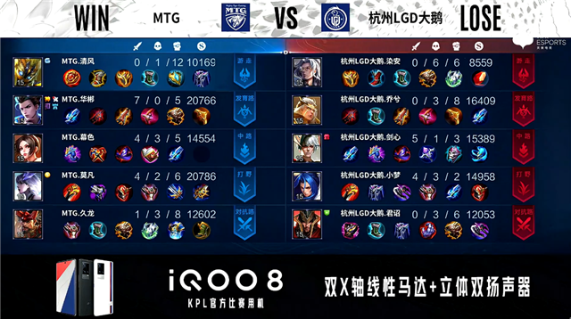 双方常规开局。1分07秒杭州LGD大鹅拿下中路河道之灵。2分24秒发育路团战杭州LGD大鹅打出1换2。5分44秒杭州LGD大鹅对抗路击杀马超。7分26秒杭州LGD大鹅阿拿下庄周。7分38秒中路团战MTG击杀牛魔。9分50秒野区团战杭州LGD大鹅打出0换2。10分01秒杭州LGD大鹅摧毁敌方中路外塔。10分14秒杭州LGD大鹅拿下暗影暴君。10分44秒发育路团战MTG击杀牛魔。12分24秒杭州LGD大鹅拿下暗影主宰。13分23秒杭州LGD大鹅野区击杀盾山。13分32秒杭州LGD大鹅摧毁敌方中路高地塔。15分04秒杭州LGD大鹅对抗路击杀盾山。16分35秒杭州LGD大鹅拿下暗影主宰。18分15秒杭州LGD大鹅强点水晶拿下比赛。
