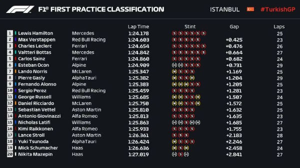 在一练过程中,汉密尔顿三段刷紫排列P1,维斯塔潘落后0.425秒(感觉他的赛车前轮转向不足),法拉利表现得不错。当然,最重要的信息是汉密尔顿更换内燃机,正赛将罚退10位。
