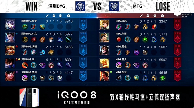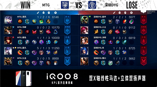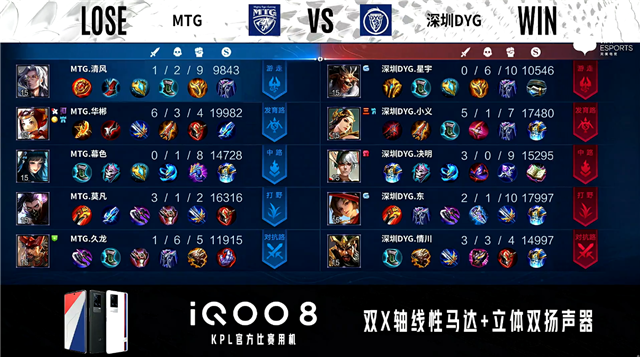 双方常规开局,1分29秒深圳DYG野区团战打出1换3。21分22秒MTG对抗路击杀夏侯惇。4分04秒野区团战MTG打出1换3。5分01秒MTG摧毁敌方中路外塔。5分57秒MTG野区击杀不知火舞。8分07秒MTG拿下暴君。10分29秒MTG拿下暗影主宰。10分54秒MTG拿下暗影暴君。11分42秒MTG摧毁敌方中路高地塔。12分33秒MTG摧毁敌方发育路高地塔。13分42秒MTG摧毁敌方水晶拿下比赛。