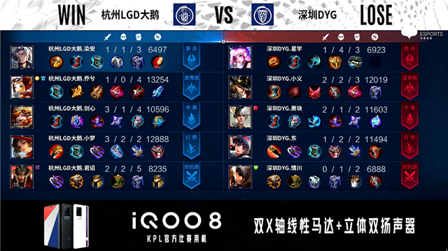 双方常规开局。1分01秒杭州LGD大鹅发育路击杀牛魔拿到一血。2分24秒深圳DYG拿下暴君。3分24秒深圳DYG中路击杀露娜。3分32秒杭州LGD大鹅摧毁敌方发育路外塔。3分42秒中路下河道团战深圳DYG打出0换2。4分52秒深圳DYG拿下主宰。5分21秒双方中路1换1。6分31秒深圳DYG对抗路击杀东皇太一。7分56秒双方发育路1换1,深圳DYG摧毁敌方发育路二塔。8分23秒杭州LGD大鹅摧毁敌方中路外塔。9分30秒中路团战深圳DYG打出0换2。12分07秒深圳DYG拿下暗影主宰。13分38秒深圳DYG发育路击杀露娜。14分06秒深圳DYG摧毁敌方中路二塔。14分41秒深圳DYG拿下暗影暴君。16分21秒对抗路团战杭州LGD大鹅打出0换2。18分12秒深圳DYG野区击杀廉颇。18分59秒深圳DYG拿下暗影暴君。20分46秒野区团战深圳DYG打出2换4。21分38秒深圳DYG摧毁水晶拿下比赛。