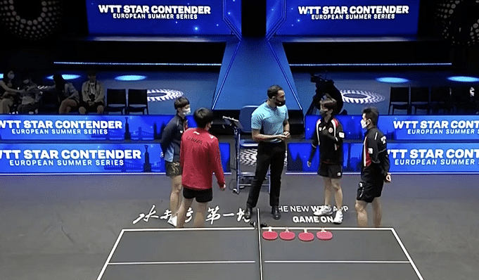 第五局,双方比分交替领先,5-5平之后王曼昱和王楚钦连得2分取得领先,无奈失误偏多被对手追平。关键时刻,王楚钦和王曼昱将对手压制在反手位,强势爆发,再度建立优势。黄镇廷和杜凯琹不放弃,再度追至9-9平,双方打得非常激烈。王楚钦关键失误,对手10-9拿到赛点。王曼昱强势扳平。王楚钦得分,中国队得到赛点,王楚钦怒吼。王楚钦和王曼昱吃到黄牌,被认为是延误比赛时间。这一局,王楚钦和王曼昱以14-12拿下,大比分3-2取得胜利。