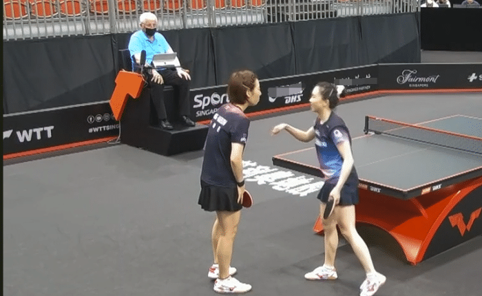 接下来进行的一场比赛是女双的比赛王曼昱 /孙颖莎对阵韩国组合田志希/梁夏银,本届赛事孙颖莎的任务也是比较的重,她分别参加了女单的比赛,混双的比赛,女双的比赛,此面的赛事孙颖莎发挥十分不错,加上对手的实力相对不是很强,她皆是取得了胜利,她与王曼昱搭档的女双组合也是夺冠大热门,女双组合两人排名世界第一。