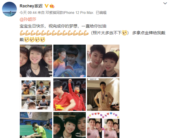孙颖莎的搭档孙铭阳也送上祝福:mini胖,生日大快乐,祝你愿望通通实现,早日实现梦想,没照片了,该照相了。