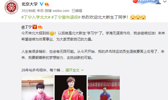热搜榜第一!丁宁宣布退役,刘国梁寄语,北大欢迎,张继科躺枪