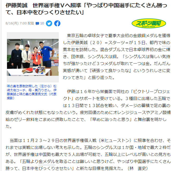 伊藤美诚还表示世乒赛中国最多可以有5名选手参加单打比赛,比奥运会水平还要高,更难取得金牌。很显然伊藤美诚对于自己的实力还是非常自信的,她觉得自己经历了这届本土进行的奥运会之后收获颇丰,有击败中国队拿下金牌的豪迈,但也有连续输给孙颖莎之后无缘冠军的遗憾,可以说是东京奥运会让伊藤美诚涨了不少的经验,所以在展望世乒赛的时候,伊藤美诚再度放出豪言。