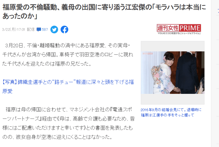 24直播网3月23日讯 ,日本媒体《女性周刊》发表一篇评论文章。文章的标题是:福原爱事件中,护送丈母娘回国的江宏杰真的有“情感暴力”吗?在文章中,作者为江宏杰“鸣冤”,称从种种迹象来看,江宏杰不太像会用言语暴力来对待福原爱的人。此外,作者也分析可能是异域的生活,以及对于婚姻太理想化,让福原爱的婚后生活并不甜蜜。