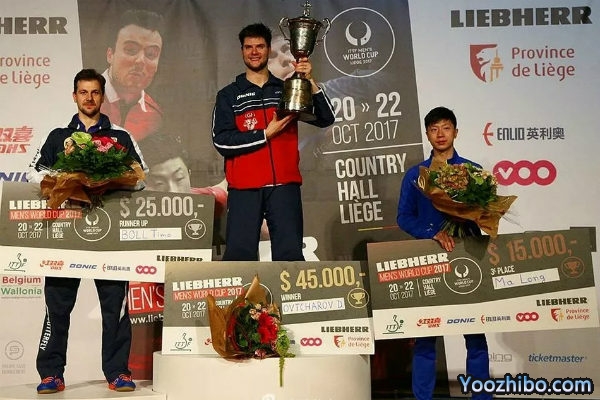 北京时间10月22日,2017年第38届男乒世界杯男单决赛,德国的奥恰洛夫4-2(10-12、11-8、11-7、9-11、11-7、11-2)战胜队友波尔夺冠,生涯里首次夺取世界杯冠军。这是德国球员继1998年罗斯科夫、2002、2005年波尔夺冠之后,德国球员第四次登上男乒世界杯冠军领奖台。两人也因此分别拿到了4.5万美元、2.5万美元的冠军和亚军奖金。
