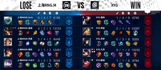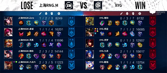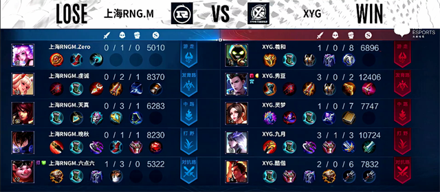1分56秒XYG越塔击杀刘邦,兰陵王拿下一血。2分17秒娜可露露拿下主宰,云缨拿下暴君。4分40秒下路团战,XYG打出2换3,娜可露露拿下三杀,马可波罗推掉下路一塔。5分40秒XYG上路越塔,兰陵王被击杀。6分钟XYG上路一塔被破。6分50秒娜可露露拿下暴君。8分17秒中路团战,武则天被击杀。9分20秒娜可露露拿下主宰。11分49秒娜可露露拿下主宰。12分钟中路团战,上海RNG.M打出1换2。14分30秒中路团战,虞姬被击杀。15分16秒云缨拿下暴君。16分25秒中路团战,XYG打出2换3。17分30秒XYG推掉水晶率先拿下赛点。