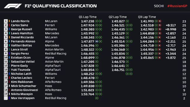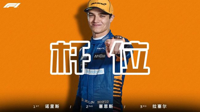 最终Q3停表‍,诺里斯凭借自己出色的发挥,以1:41.993的成绩拿下生涯首个杆位!‍塞恩斯第二,落后0.517秒,‍‍‍‍‍拉塞尔又一次在雨天中表现‍‍‍‍‍出色,最终排在第三。汉密尔顿在最后的计时圈中出现失误,最终只排在第‍四‍,‍里卡多‍第‍五。第六至第十位的车手是阿隆索、博塔斯、斯托尔、佩雷兹和奥康。‍‍‍‍‍