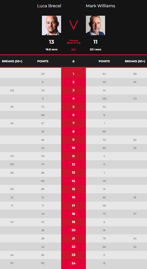 在布雷切尔和马克威廉姆斯的第一阶段比赛中,两位球员的发挥旗鼓相当。在首局比赛中,威廉姆斯率先凭借单杆打出68分的表现以94:20拿下此局比赛的胜利直接取得1-0的领先拔得头筹。第2局,威廉姆斯单杆打出55以99:6拿下此局比赛的胜利从而以2-0继续领先布雷切尔。第3局,布雷切尔单杆打出103分以112:10拿下此局比赛并以1-2落后威廉姆斯。第4局,威廉姆斯单杆113分以120:9拿下此局比赛3-1领先布雷切尔。第5局,布雷切尔单杆50分72:52拿下此局以2-3落后威廉姆斯。第6局,布雷切尔68:8拿下此局以3-3战平威廉姆斯。第7局,布雷切尔单杆50分57:1拿下此局4-3反超威廉姆斯。第8局,威廉姆斯68:32拿下此局4-4战平布雷切尔。