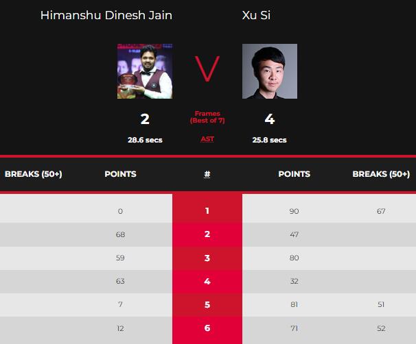 在徐思和贾恩的比赛中,徐思的表现同样是让人难以满意。在首局比赛中,徐思率先打出状态,他凭借单杆67分的表现以90:0零封对手取得1-0的领先迎来开门红。第二局,贾恩终于打出了不错的竞技表现,他凭借多次上手的机会以68:47拿下此局比赛的胜利从而以1-1战平徐思。第三局,徐思凭借出色把握机会的能力以80:59拿下此局比赛的胜利从而以2-1继续领先贾恩。第四局,贾恩凭借多次上手机会以63:32拿下此局比赛的胜利从而以2-2战平徐思。第五局,徐思单杆轰出51分以81:7拿下此局比赛的胜利从而以3-2领先贾恩强势拿到赛点。第六局,徐思凭借71:12的表现以4-2击败贾恩强势晋级64强席位。