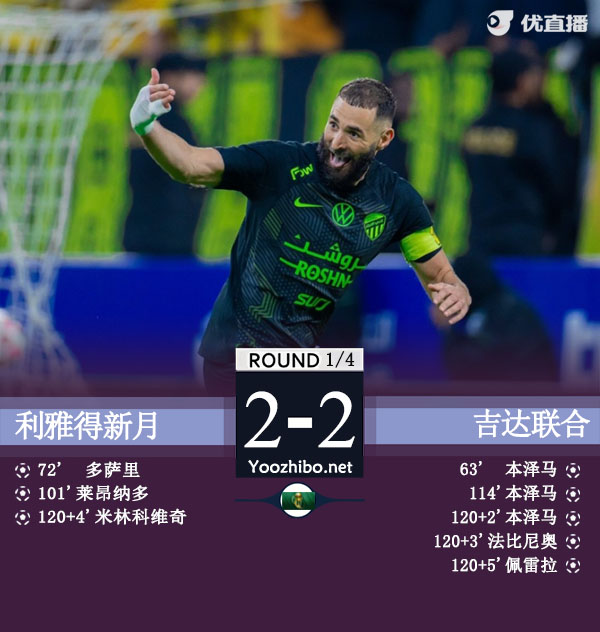 24直播网讯 北京时间1月8日凌晨1:30,沙王冠1/4决赛,利雅得新月坐镇法赫德国王国际体育场迎战吉达联合。上半场米特洛维奇伤退,本泽马进球因越位在先无效,利雅得新月暂0-0吉达联合;下半场沙恩奎特助攻本泽马破门,多萨里扳平,利雅得新月1-1吉达联合,比赛进入加时;加时赛上半场哈尔比助攻莱昂纳多建功,本泽马破门将比分扳平,阿尔-比什头球被吹,利雅得新月2-2吉达联合,比赛进入点球大战;点球大战中利雅得新月卡努、莱昂纳多和马尔科姆三人失点,最终吉达联合点球3-1,总比分5-3晋级四强。
