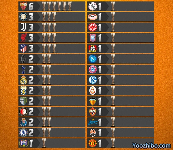 欧联杯冠军数排行榜:塞维利亚6冠稳居榜首!