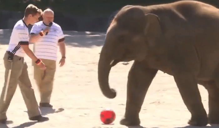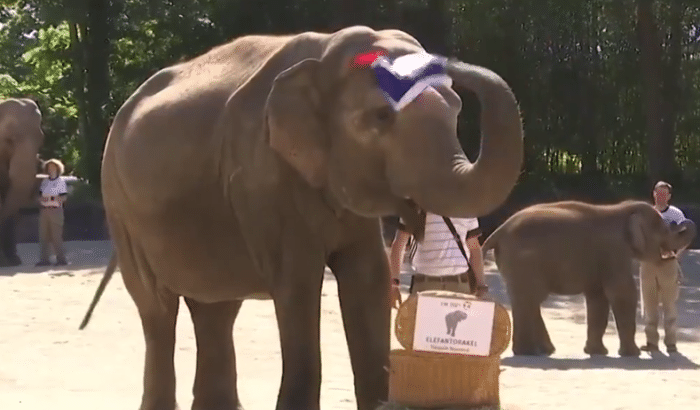 这是德国汉堡市动物园的大象,它的名字叫Yashoda,今年已经41岁了,Yashoda将会在本届欧洲杯预测德国队全部的比赛结果,第一场预测德法大战,它用长鼻子拿出了法国国旗挥舞,意思就是预测法国队可以获胜。根据规则Yashoda没有在随后拿出德国国旗(平局),意思就是法国队会拿下这场关键战的胜利。