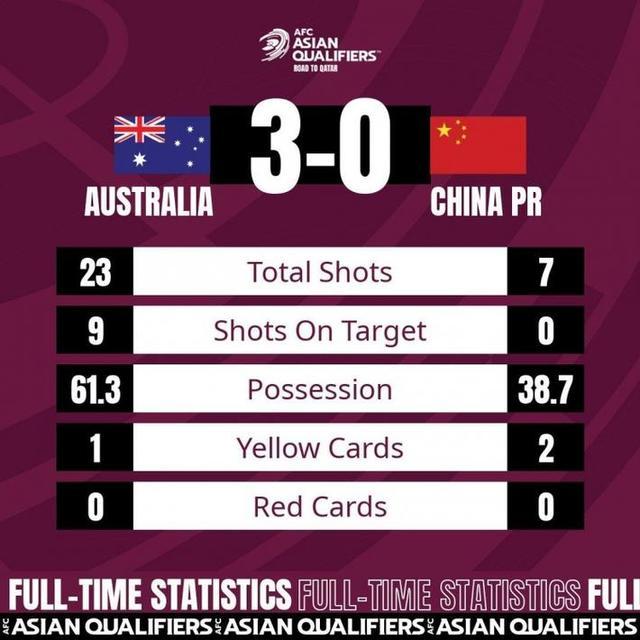 而中国在12强赛首轮0-3负澳大利亚,中澳数据悬殊巨大,射门23-7,射正9-0,控球61.3-38.7,黄牌1-2。