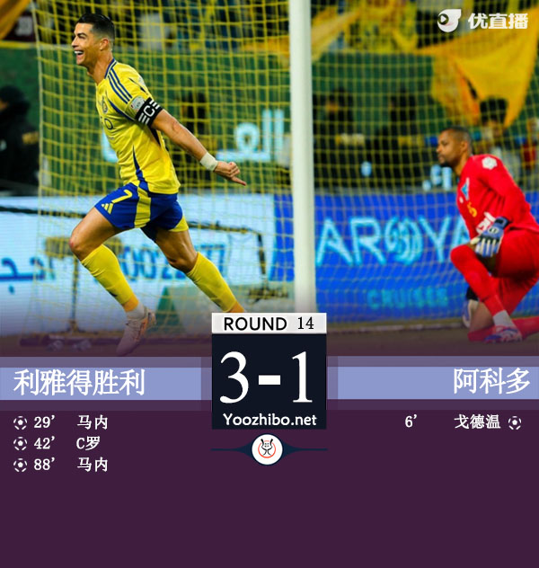 24直播网讯 北京时间1月10日01:00,沙特联第14轮利雅得胜利迎战阿科多的比赛在沙特国王大学体育场进行,上半场拉波尔特解围失误古德温闪击得手,随后马内补射扳平比分,马内造点C罗点射反超比分,C罗取得2025年首球,下半场马内头球破门扩大比分,最终利雅得胜利3-1阿科多。