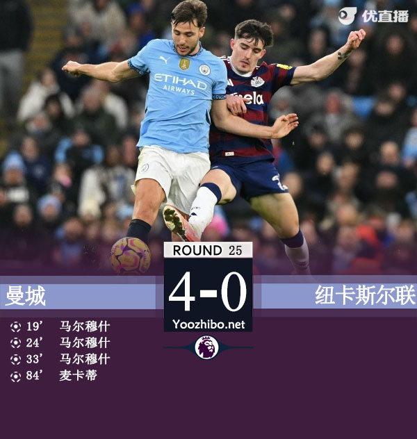 24直播网讯 北京时间2月15日23:00,2024-25赛季英超联赛第25轮,曼城坐镇伊蒂哈德球场迎战纽卡斯尔。上半场埃德森长传助攻马尔穆什单刀球挑射破门,马尔穆什又接到京多安和萨维尼奥助攻再进2球,半场戴帽,帮助曼城暂3-0领先纽卡斯尔;下半场麦卡蒂破门,哈兰德助攻后伤退,最终曼城4-0战胜纽卡斯尔。
