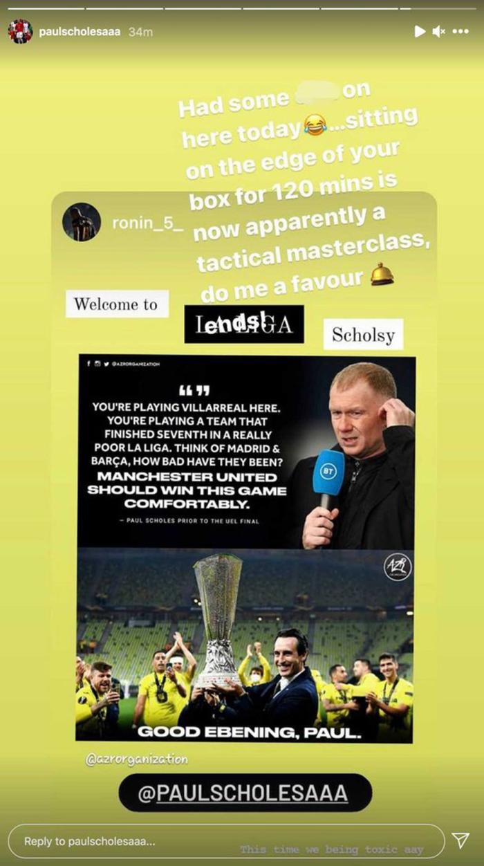 比利亚雷亚尔获胜后,斯科尔斯自然难免受到嘲讽。但他对此非常不满,并认为黄色潜水艇主帅埃梅里的战术并不知道称道,只是摆铁桶阵龟缩防守。