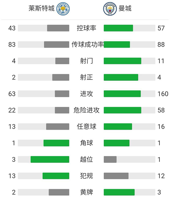 最终,全场比赛战罢,曼城客场2-0力克莱斯特城。