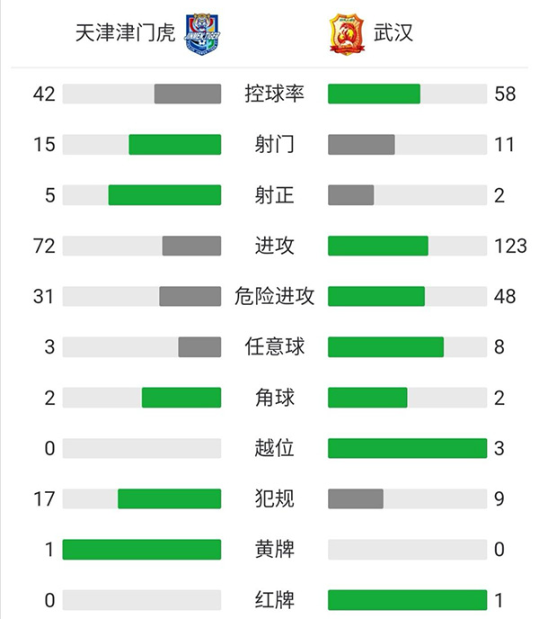 全场比赛结束,最终天津津门虎2-1击败武汉队。